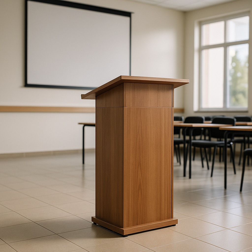 Lecture podium stand with angled reading surface and modest storage compartment.